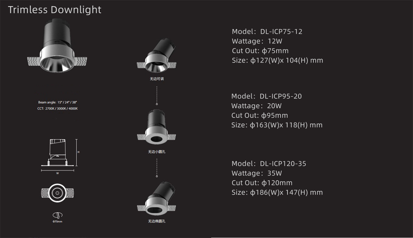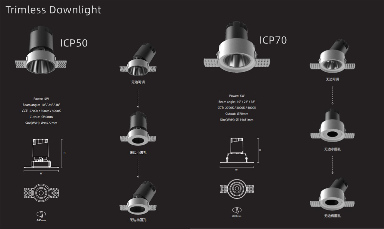 Pro Select Trimless Recessed Downlights are the most cost-effective general illumination solution for commercial-grade downlight applications. With dark light technology offerings, this excellent design allows for a quiet, comfortable, glare-free ceiling without compromising on efficacy. In addition, the frameless design ensures that the entire lamp body can be integrated with the environment, make the overall design more harmonious and comfortable.